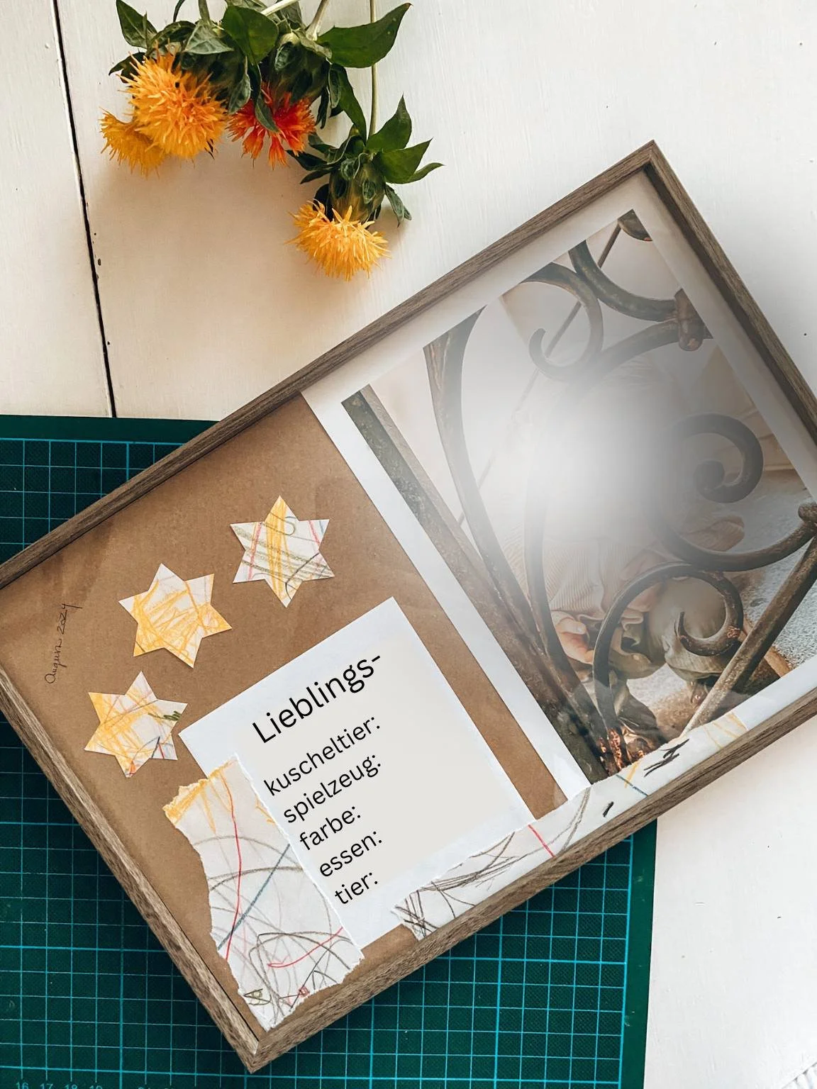 1. Collage mit Foto, Kleinkindzeichnung und Steckbrief